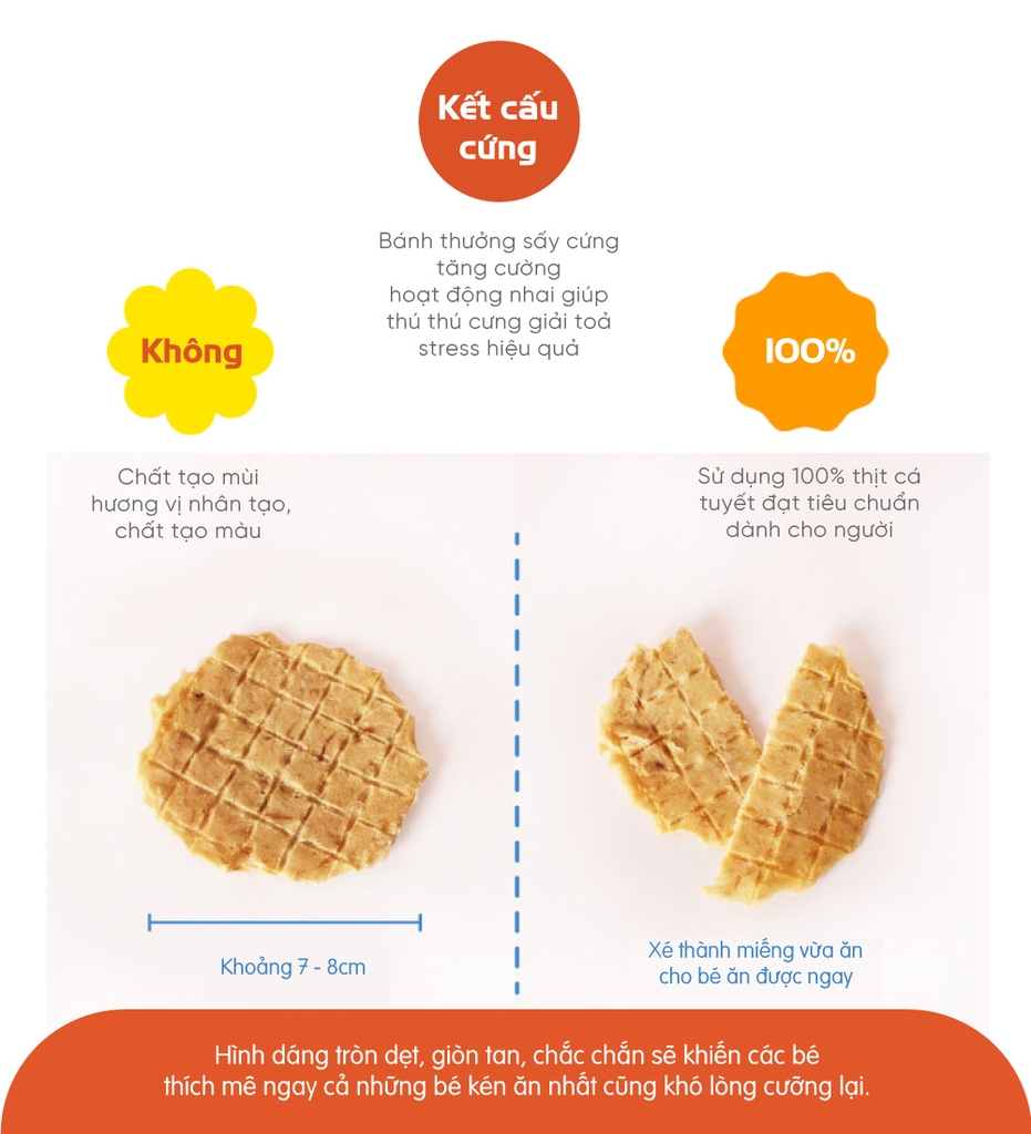 Với cấu trúc cứng, bánh cá tuyết sấy giúp vệ sinh răng miệng, làm sạch mảng bám, giúp thú cưng của bạn có hàm răng khỏe mạnh và hơi thở thơm tho.