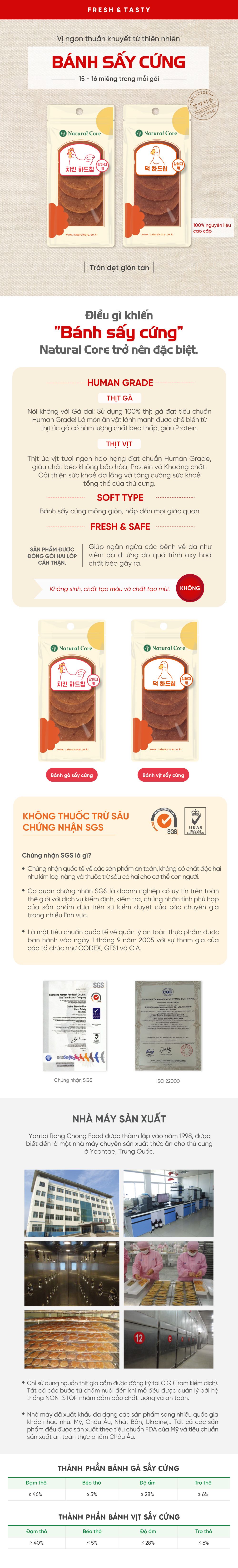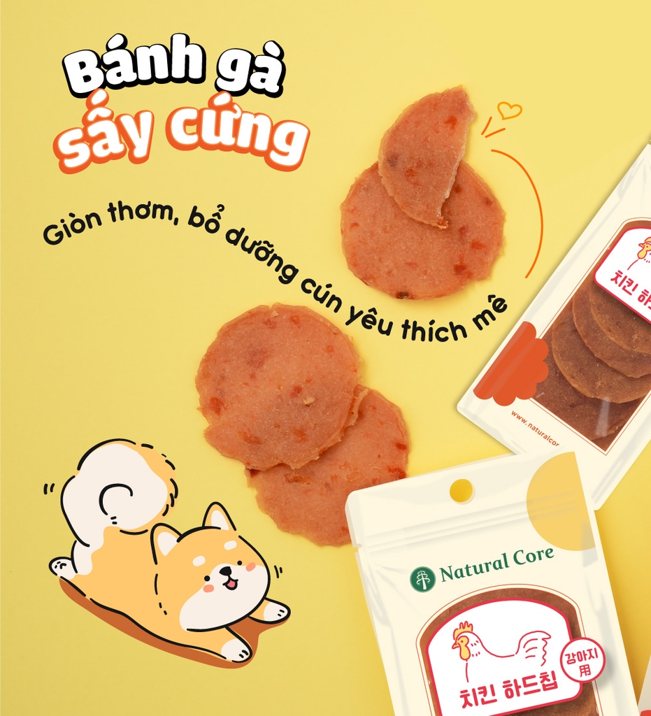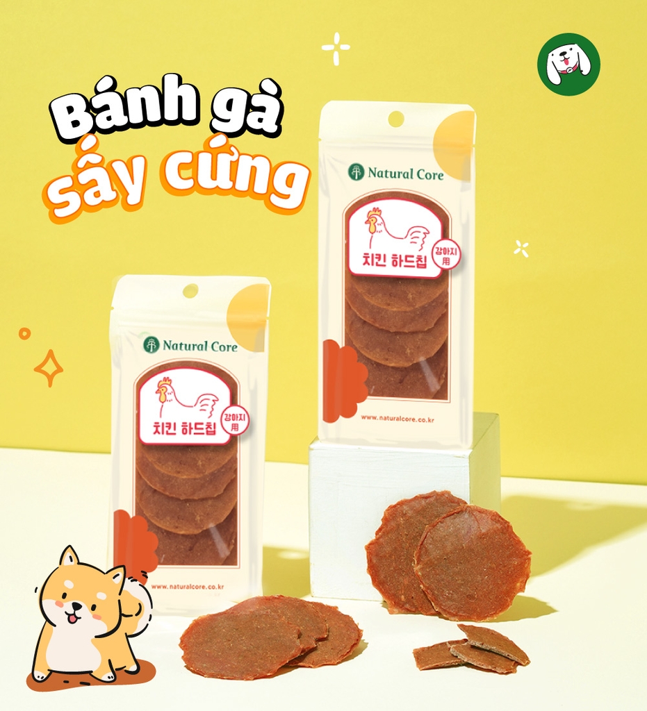 - Bánh gà sấy cứng: Thịt gà, Glycerin (dầu dừa), bột ngũ cốc, muối.