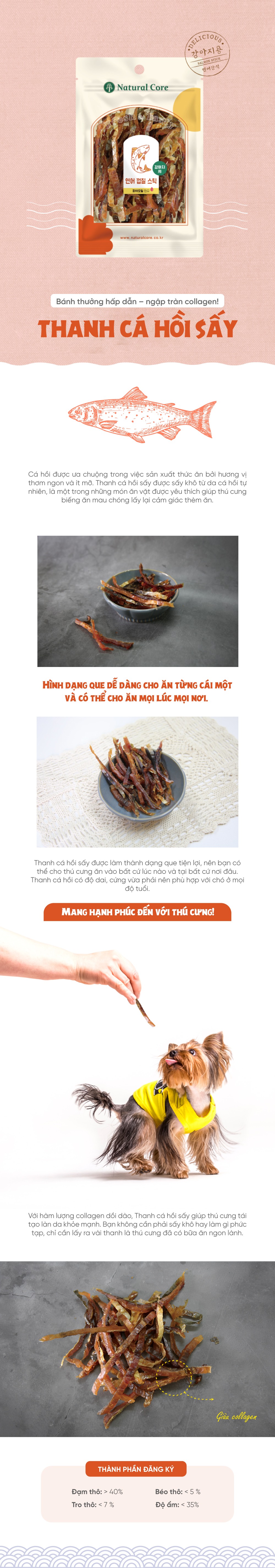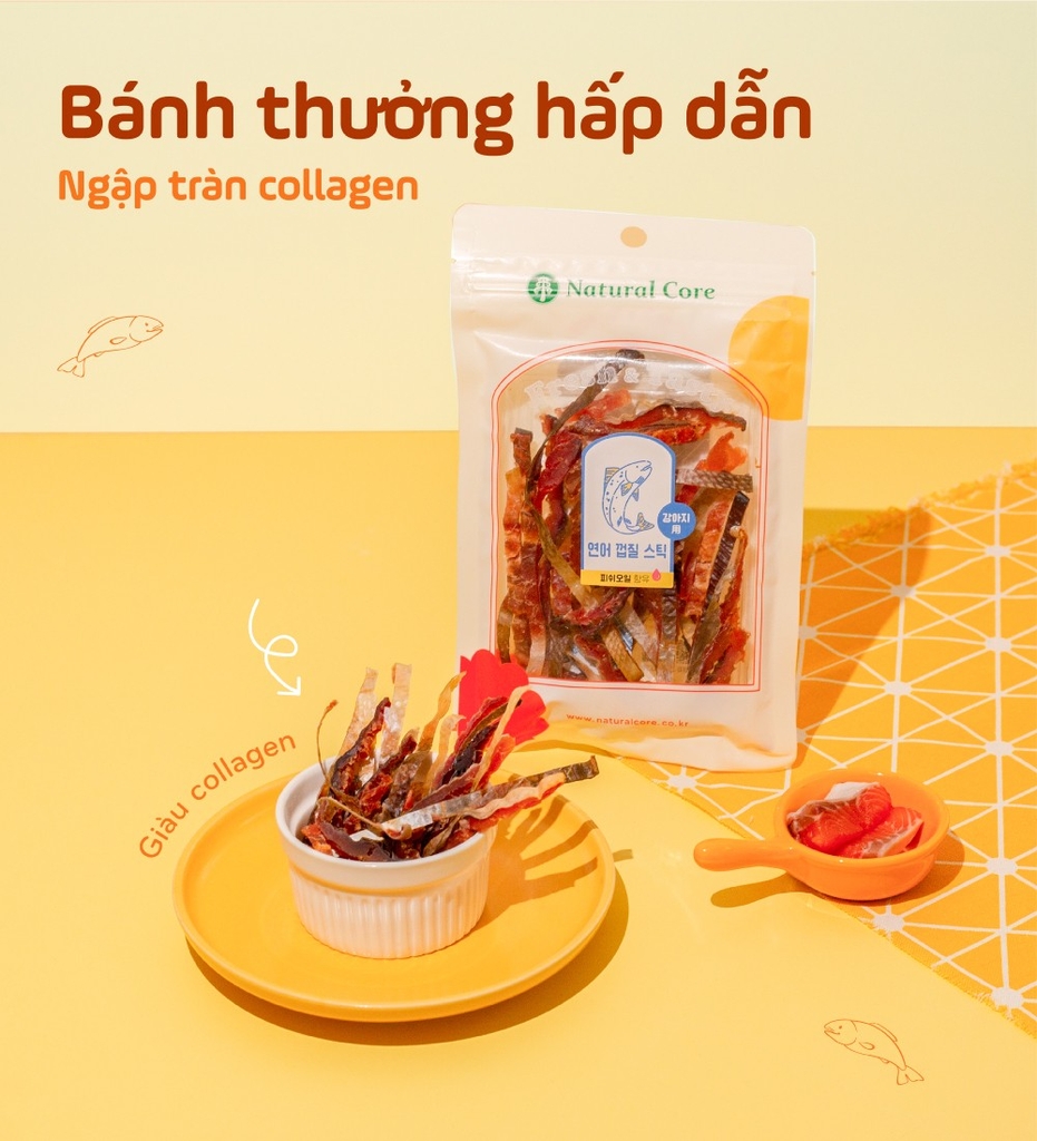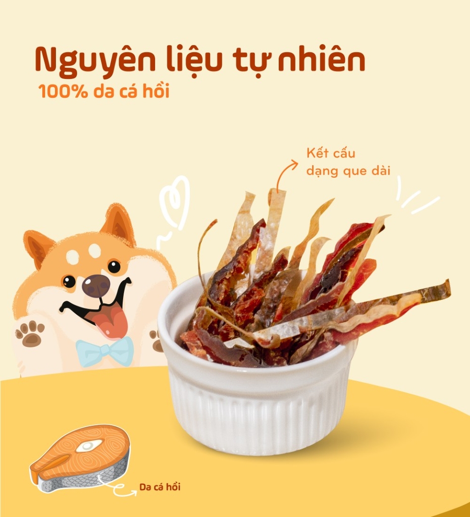 Với nguồn Collagen, Protein và Omega-3 từ da cá hồi, sản phẩm không chỉ cung cấp năng lượng dồi dào mà còn hỗ trợ sự phát triển khỏe mạnh của cơ bắp và hệ xương khớp cho thú cưng.