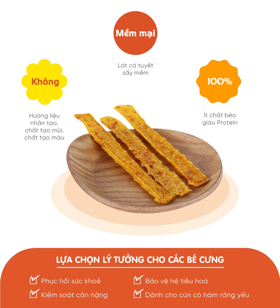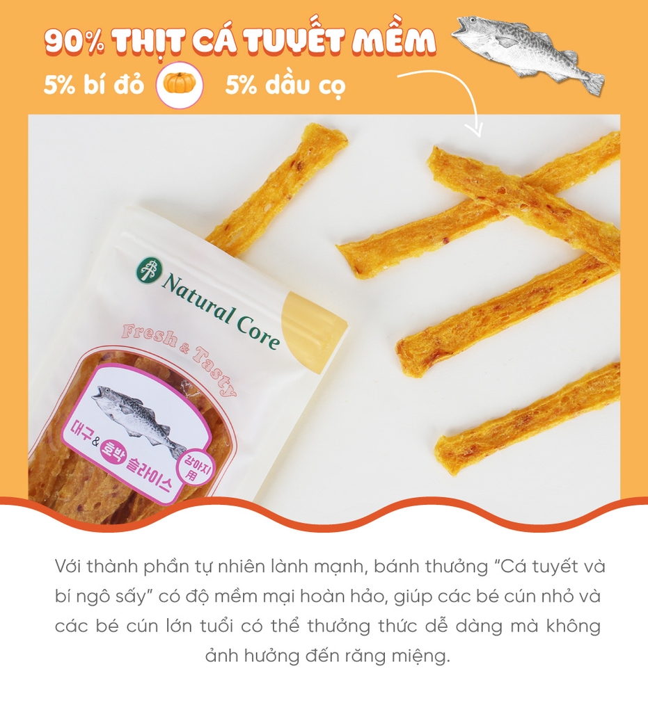 Thành phần: Thịt cá tuyết, bí ngô, Glycerin thực vật (dầu dừa).