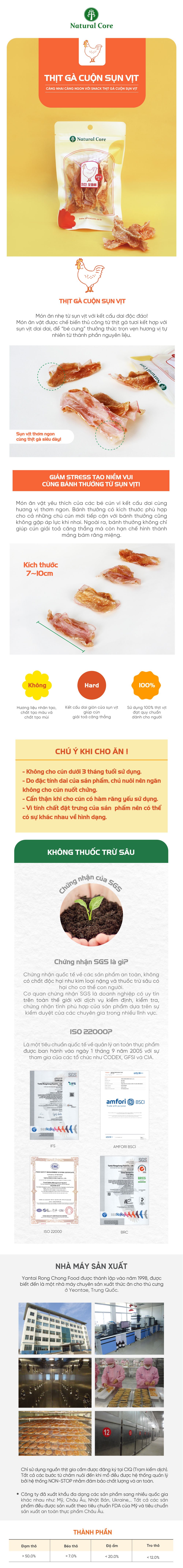 Với kết cấu mềm mại và dễ nhai của thịt gà kết hợp cùng sự dai giòn của sụn vịt, sản phẩm rất phù hợp cho các thú cưng có hàm răng yếu hoặc đang trong giai đoạn thay răng.